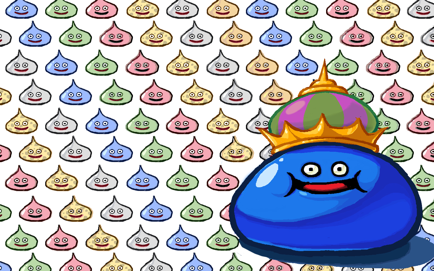 One night Thom commissioned me to draw him a desktop background that incorporated a King Slime, an enemy that has been severly underappreciated in America. I took him up on the offer and made a few variations of it. They're at a strange proportion: 1440 x 900. It's widescreen, I'm assuming.